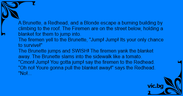 A Brunette, a Redhead, and a Blonde escape a burning building by climbing to the roof. The Firemen are on the street below, holding a blanket for them to jump into.
