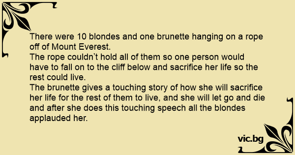 There were 10 blondes and one brunette hanging on a rope off of Mount Everest. The rope couldnt hold all of them so one person would have to fall on to the cliff below and sасrifiсе her life so the rest could live. The brunette gives a touching story of how she will sасrifiсе her life for the rest of them to live, and she will let go and die and after she does this touching speech all the blondes applauded her.