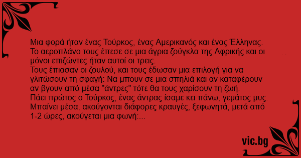 Μια φορά ήταν ένας Τούρκος, ένας Αμερικανός και ένας Έλληνας. Το αεροπλάνο τους έπεσε σε μια άγρια ζούγκλα της Αφρικής και οι μόνοι επιζώντες ήταν αυτοί οι τρεις.