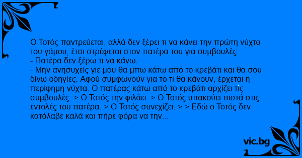 - Μην ανησυχείς γιε μου θα μπω κάτω από το κρεβάτι και θα σου δίνω οδηγίες. Αφού συμφωνούν για το τι θα κάνουν, έρχεται η περίφημη νύχτα. Ο πατέρας κάτω από το κρεβάτι αρχίζει τις συμβουλές: > Ο Τοτός την φιλάει. > Ο Τοτός υπακούει πιστά στις εντολές του πατέρα. > Ο Τοτός συνεχίζει. > > Εδώ ο Τοτός δεν κατάλαβε καλά και πήρε φόρα να την πηδήξει. Όπως τρέχει σκοντάφτει και χτυπάει το κεφάλι του στο εξωτερικό σίδερο του κρεβατιού. Τρέχουν τα αίματα τα βλέπει ο πατέρας και χαίρεται και φωνάζει: > Και ο Τοτός με τη σειρά του πιο δυνατά, πιο δυνατά.