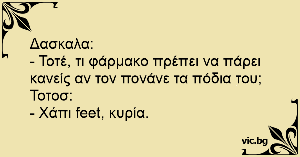 Δασκαλα: - Τοτέ, τι φάρμακο πρέπει να πάρει κανείς αν τον πονάνε τα πόδια του; Τοτοσ: - Χάπι feet, κυρία.