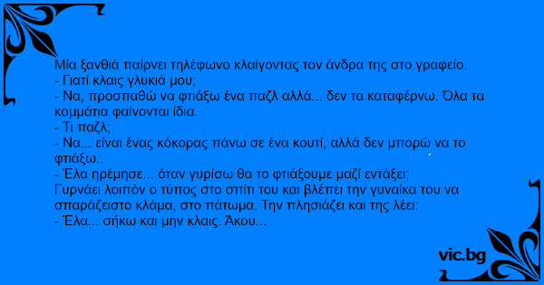 Μια ξανθιά, παίρνει τηλέφωνο μια μελαχρινή φίλη της και της λέει: - "Φτιάχνω ένα παζλ, αλλά δε μπορώ να συνδέσω τα κομμάτια, θα έρθεις να με βοηθήσεις; " - "Ναι. Τι εικόνα έχει το παζλ;", ρωτάει η...