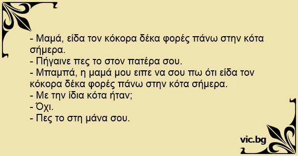 - Μπαμπά, η μαμά μου ειπε να σου πω ότι είδα τον κόκορα δέκα φορές πάνω στην κότα σήμερα.