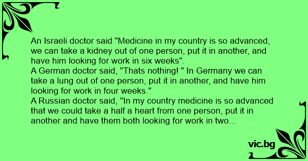 A Russian doctor said, "In my country medicine is so advanced that we could take a half a heart from one person, put it in another and have them both looking for work in two weeks."