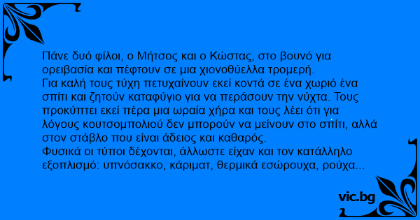 Πάνε δυό φίλοι, ο Μήτσος και ο Κώστας, στο βουνό για ορειβασία και πέφτουν σε μια χιονοθύελλα τρομερή.
