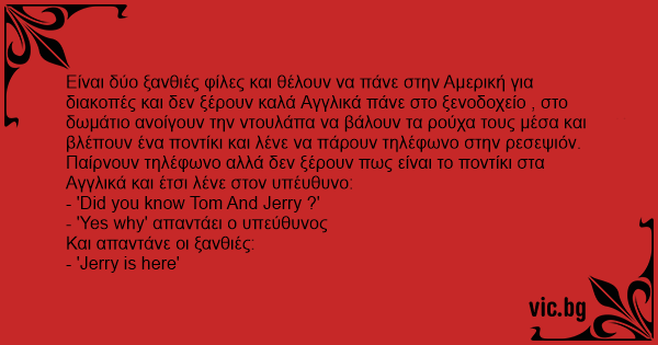 Доаѓа Ставре во Њујорк и изнајмува стан. Во него полно глувци. Сака да пријави кај газдата, ама не знае англиски. Го вика, овој го прашува: - What's the problem? Ставре: - Мммм, Tom and Jerry, you...