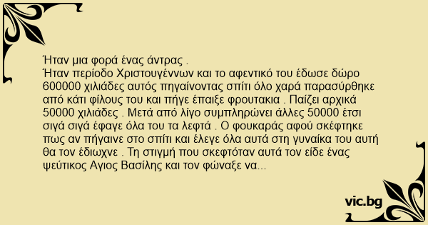 Ήταν περίοδο Χριστουγέννων και το αφεντικό του έδωσε δώρο 600000 χιλιάδες αυτός πηγαίνοντας σπίτι όλο χαρά παρασύρθηκε από κάτι φίλους του και πήγε έπαιξε φρουτακια . Παίζει αρχικά 50000 χιλιάδες . Μετά από λίγο συμπληρώνει άλλες 50000 έτσι σιγά σιγά έφαγε όλα του τα λεφτά . Ο φουκαράς αφού σκέφτηκε πως αν πήγαινε στο σπίτι και έλεγε όλα αυτά στη γυναίκα του αυτή θα τον έδιωχνε . Τη στιγμή που σκεφτόταν αυτά τον είδε ένας ψεύτικος Aγιος Βασίλης και τον φώναξε να πάει κοντά του αφού αυτός του είπε τι έγινε ο Aγιος Βασίλης σκέφτηκε πονηρά λέγοντας τον αν μου πάρεις ένα τσιμπ**κι θα σου δώσω πίσω τα λεφτά σου αφού ο άντρας το σκέφτηκε καλά τελικά του πήρε ένα τσιμπ**κι μόλις τελείωσε όλο χαρά του ζήτησε τα λεφτά και γυρνάει και του λέει τότε ο Aγιος Βασίλης " καλά πιστεύεις ακόμα στον Αι Βασίλη ; "