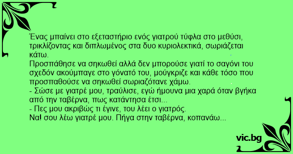 - Σώσε με γιατρέ μου, τραύλισε, εγώ ήμουνα μια χαρά όταν βγήκα από την ταβέρνα, πως κατάντησα έτσι...