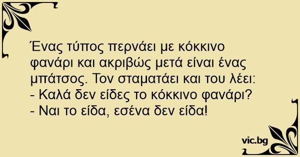 Ένας τύπος περνάει με κόκκινο φανάρι και ακριβώς μετά είναι ένας μπάτσος. Τον σταματάει και του λέει: