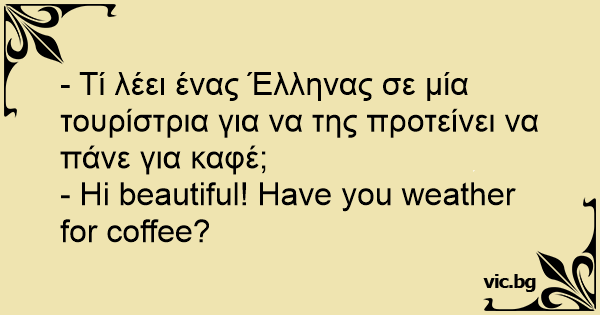 - Τί λέει ένας Έλληνας σε μία τουρίστρια για να της προτείνει να πάνε για καφέ;