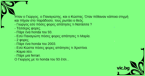 Ήταν ο Γιώργος, ο Παναγιώτης, και ο Κώστας. Όταν πέθαναν κάποια στιγμή και πήγαν στο παράδεισο, τους ρωτάει ο θεός.