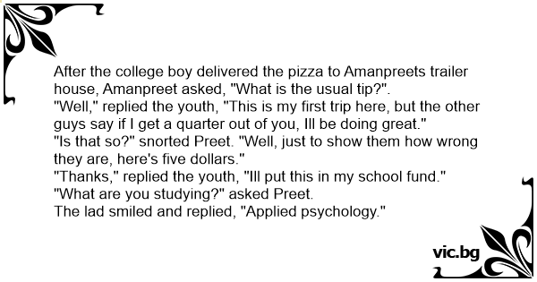 A college pizza delivery boy arrived at the house of Larry Johnson. He delivered the pizza to his trailer. After giving it to him, Larry asked: “What is the usual tip?” “Well,” replied the youth, “this is my first trip here, but the other guys say if I get a quarter out of you, I’ll be doing...
