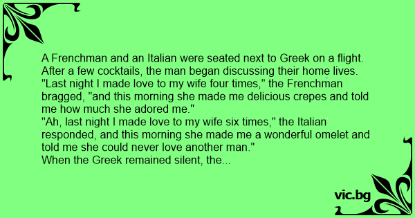When the Greek remained silent, the Frenchman smugly asked, "And how many times did you make love to your wife last night?"