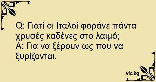 Q: Γιατί οι Ιταλοί φοράνε πάντα χρυσές καδένες στο λαιμό;<br />A: Για να ξέρουν ως που να ξυρίζονται.