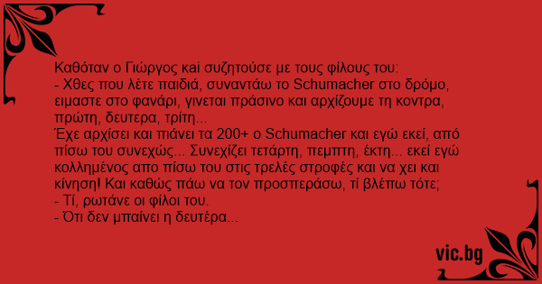 - Χθες που λέτε παιδιά, συναντάω το Schumacher στο δρόμο, ειμαστε στο φανάρι, γινεται πράσινο και αρχίζουμε τη κοντρα, πρώτη, δευτερα, τρίτη...
