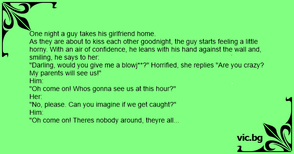 Το αγόρι γυρίζει την κοπελιά του στο σπίτι πριν (ως συνήθως) τα μεσάνυχτα. Όταν φτάνουν στην εξώπορτα, ακουμπάει το χέρι στον τοίχο και της λεει, -«γλυκιά μου κάνε μου μια πίπα» -«τι? είσαι...