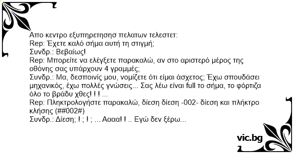 Συνδρ.: Mα, δεσποινίς μου, νομίζετε ότι είμαι άσχετος; Έχω σπουδάσει μηχανικός, έχω πολλές γνώσεις... Σας λέω είναι full το σήμα, το φόρτιζα όλο το βράδυ χθες! ! ! ...