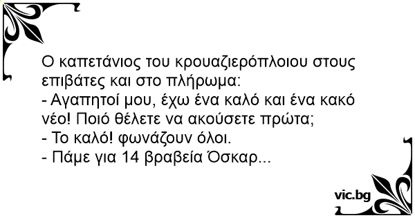 Μαζεύει κάποτε ο καπετάνιος το πλήρωμα και τους επιβάτες στο κατάστρωμα.. - Κυρίες και κύριοι.. έχω καλά και άσχημα νέα να σας πω... τα καλά είναι ότι πάμε για 11 όσκαρ...