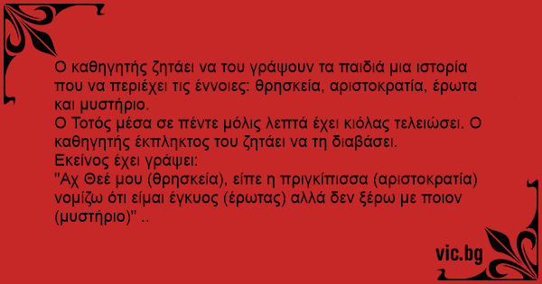 Ο καθηγητής ζητάει να του γράψουν τα παιδιά μια ιστορία που να περιέχει τις έννοιες: θρησκεία, αριστοκρατία, έρωτα και μυστήριο.