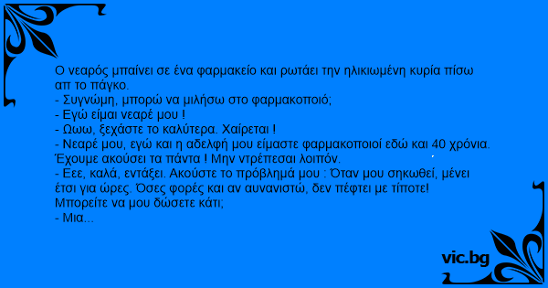 O νεαρός μπαίνει σε ένα φαρμακείο και ρωτάει την ηλικιωμένη κυρία πίσω απ το πάγκο.