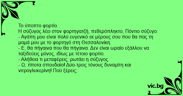 - Αλήθεια τι μεταφέρεις; ρωτάει η σύζυγος.