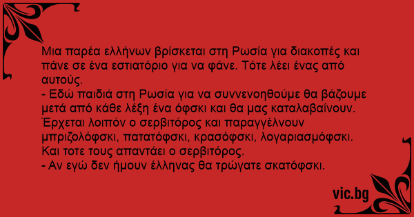 Μια παρέα ελλήνων βρίσκεται στη Ρωσία για διακοπές και πάνε σε ένα εστιατόριο για να φάνε. Τότε λέει ένας από αυτούς.