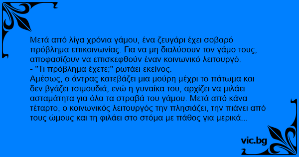 - "Είδατε;" λέει στον σύζυγο. "Αυτό χρειάζεται η γυναίκα σας δυο φορές την εβδομάδα κι όλα τα προβλήματα σας θα λυθούν!"