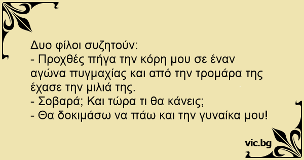 - Προχθές πήγα την κόρη μου σε έναν αγώνα πυγμαχίας και από την τρομάρα της έχασε την μιλιά της.