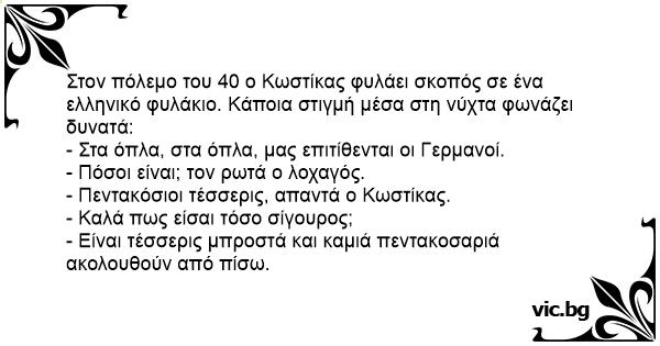 Στον πόλεμο του 40 ο Κωστίκας φυλάει σκοπός σε ένα ελληνικό φυλάκιο. Κάποια στιγμή μέσα στη νύχτα φωνάζει δυνατά: