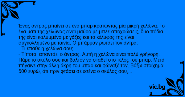 - Τίποτα, απαντάει ο άντρας. Αυτή η χελώνα είναι πολύ γρήγορη. Πάρε το σκύλο σου και βάλτον να σταθεί στο τέλος του μπαρ. Μετά πήγαινε στην άλλη άκρη του μπαρ και φώναξέ τον. Βάζω στοίχημα 500 ευρώ, ότι πριν φτάσει σε εσένα ο σκύλος σου, η χελώνα μου θα είναι ήδη εκεί.