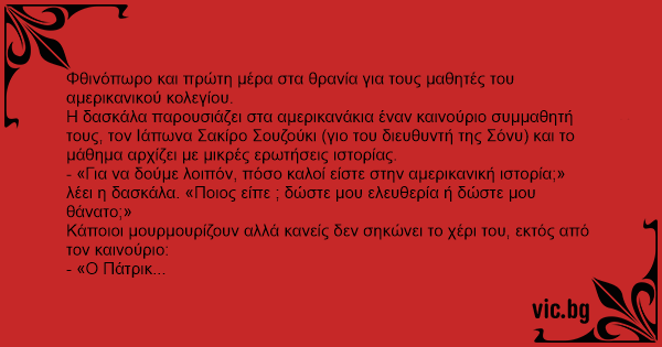 - «Για να δούμε λοιπόν, πόσο καλοί είστε στην αμερικανική ιστορία;» λέει η δασκάλα. «Ποιος είπε ; δώστε μου ελευθερία ή δώστε μου θάνατο;»