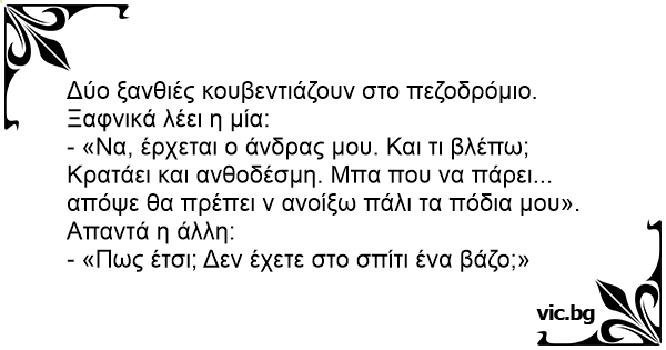 - «Να, έρχεται ο άνδρας μου. Και τι βλέπω; Κρατάει και ανθοδέσμη. Μπα που να πάρει... απόψε θα πρέπει ν ανοίξω πάλι τα πόδια μου».