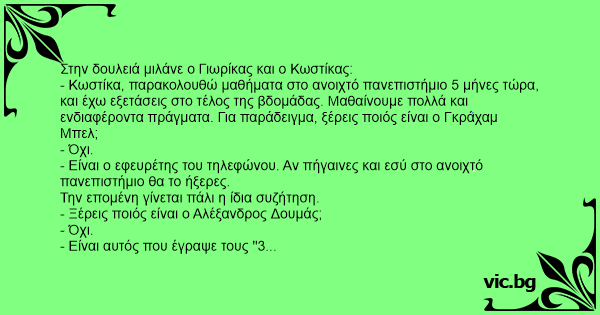 - Κωστίκα, παρακολουθώ μαθήματα στο ανοιχτό πανεπιστήμιο 5 μήνες τώρα, και έχω εξετάσεις στο τέλος της βδομάδας. Μαθαίνουμε πολλά και ενδιαφέροντα πράγματα. Για παράδειγμα, ξέρεις ποιός είναι ο Γκράχαμ Μπελ;