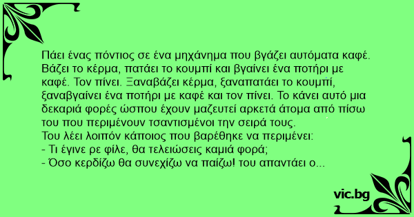 Βάζει το κέρμα, πατάει το κουμπί και βγαίνει ένα ποτήρι με καφέ. Τον πίνει. Ξαναβάζει κέρμα, ξαναπατάει το κουμπί, ξαναβγαίνει ένα ποτήρι με καφέ και τον πίνει. Το κάνει αυτό μια δεκαριά φορές ώσπου έχουν μαζευτεί αρκετά άτομα από πίσω του που περιμένουν τσαντισμένοι την σειρά τους.