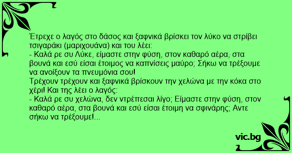 Έτρεχε ο λαγός στο δάσος και ξαφνικά βρίσκει τον λύκο να στρίβει τσιγαράκι (μαριχουάνα) και του λέει: