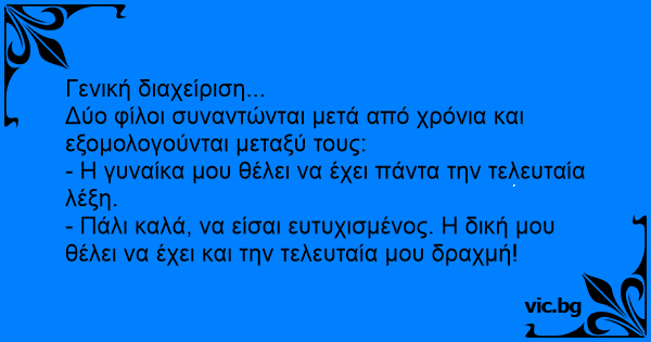 - Πάλι καλά, να είσαι ευτυχισμένος. Η δική μου θέλει να έχει και την τελευταία μου δραχμή!
