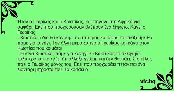 Ήταν ο Γιωρίκας και ο Κωστίκας, και πήγανε στη Αφρική για σαφάρι. Εκεί που προχωρούσαν βλέπουν ένα ξέφωτο. Κάνει ο Γιωρίκας: