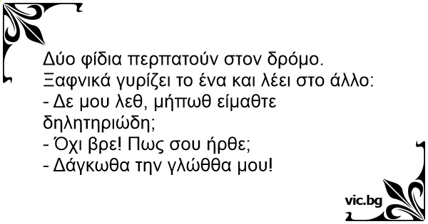 Δυο φίδια συζητάνε: - Ρε συ, ξέρεις αν είμαστε δηλητηριώδη; - Όχι δεν είμαστε, γιατί ρωτάς; - Δάγκωσα τη γλώσσα μου ρε γαμώτο!