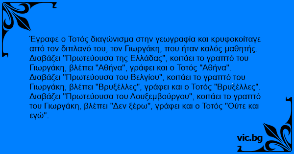 Διαβάζει "Πρωτεύουσα του Βελγίου", κοιτάει το γραπτό του Γιωργάκη, βλέπει "Βρυξέλλες", γράφει και ο Τοτός "Βρυξέλλες".