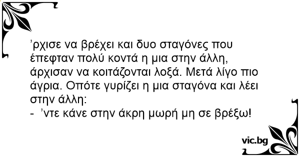 ʼρχισε να βρέχει και δυο σταγόνες που έπεφταν πολύ κοντά η μια στην άλλη, άρχισαν να κοιτάζονται λοξά. Μετά λίγο πιο άγρια. Οπότε γυρίζει η μια σταγόνα και λέει στην άλλη: