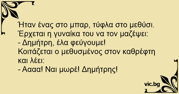 Ήταν ένας στο μπαρ, τύφλα στο μεθύσι. Έρχεται η γυναίκα του να τον μαζέψει: