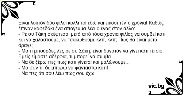 Είναι λοιπόν δύο φίλοι κολλητοί εδώ και εικοσιπέντε χρόνια! Καθώς έπιναν καφεδάκι ένα απόγευμα λέει ο ένας στον άλλο: