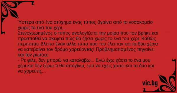 - Ρε φίλε, δεν μπορώ να καταλάβω... Εγώ έχω χάσει το ένα μου χέρι και δεν ξέρω τι θα απογίνω, εσύ να έχεις χάσει και τα δύο και να χορεύεις από την χαρά σου!