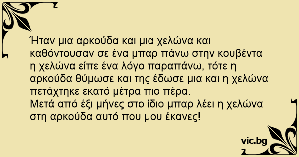 Ήταν μια αρκούδα και μια χελώνα και καθόντουσαν σε ένα μπαρ πάνω στην κουβέντα η χελώνα είπε ένα λόγο παραπάνω, τότε η αρκούδα θύμωσε και της έδωσε μια και η χελώνα πετάχτηκε εκατό μέτρα πιο πέρα.