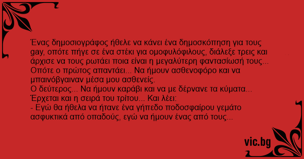 Ένας δημοσιογράφος ήθελε να κάνει ένα δημοσκόπηση για τους gаy, οπότε πήγε σε ένα στέκι για ομοφυλόφιλους, διάλεξε τρεις και άρχισε να τους ρωτάει ποια είναι η μεγαλύτερη φαντασίωσή τους...