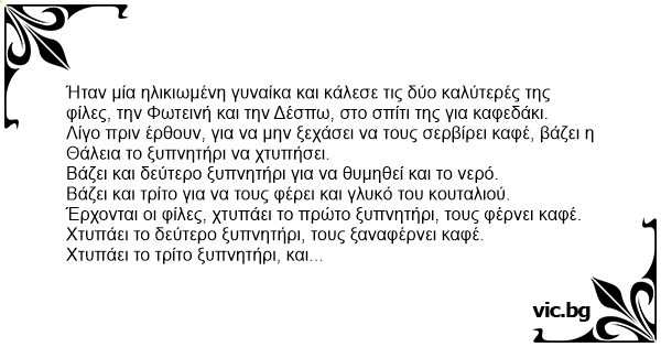 Ήταν μία ηλικιωμένη γυναίκα και κάλεσε τις δύο καλύτερές της φίλες, την Φωτεινή και την Δέσπω, στο σπίτι της για καφεδάκι.