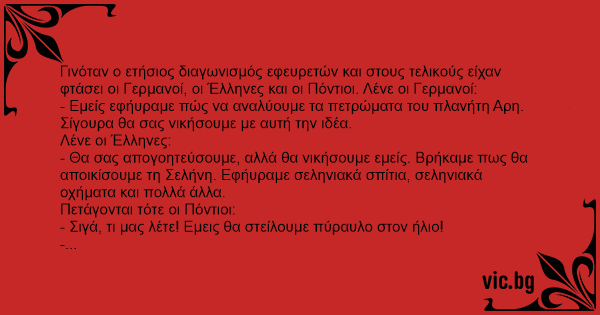 Γινόταν ο ετήσιος διαγωνισμός εφευρετών και στους τελικούς είχαν φτάσει οι Γερμανοί, οι Έλληνες και οι Πόντιοι. Λένε οι Γερμανοί: