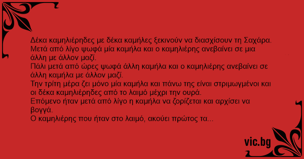 Αυτό έγινε μέχρι και τον ένατο, ο οποίος επίσης γυρίζει στον δέκατο καμηλιέρη, ο οποίος κρατιόταν από την ουρά και του λέει μέσα στη μαύρη απελπισία: