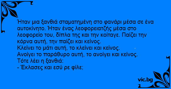 Ήταν μια ξανθιά σταματημένη στο φανάρι μέσα σε ένα αυτοκίνητο. Ήταν ένας λεοφορειατζής μέσα στο λεοφορείο του, δίπλα της και την κοίταγε. Παίζει την κόρνα αυτή, την παίζει και κείνος.