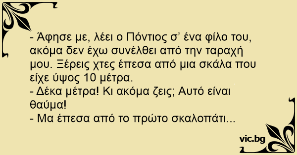 - Άφησε με, λέει ο Πόντιος σʼ ένα φίλο του, ακόμα δεν έχω συνέλθει από την ταραχή μου. Ξέρεις χτες έπεσα από μια σκάλα που είχε ύψος 10 μέτρα.